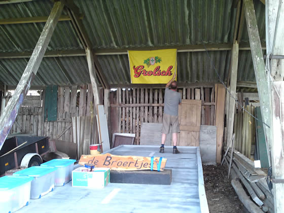 Ook de tweede bouwdag is er weer volop gewerkt door de wagenbouwers. Broertjes Marco, die zich normaal gesproken alleen druk maakt voor de bloemenafwerking, kwam op het goede idee om onderdelen van de wagen elders te laten vervaardigen. Hiermee waren natuurlijk de bouwlieden het mee eens, zo min mogelijk werk past iedereen. Dit jaar wordt de bouw plaats dus assembleerplaats. Wel werd er al begonnen om een soort podium te bouwen, waar broertje Edwin alvast zijn trommelkunsten liet gelden. Na een klein uurtje werk vonden de meesten het wel goed en begonnen aan het goudgele vocht. Nog tijd genoeg, aldus de wagenbouwers.![]() |