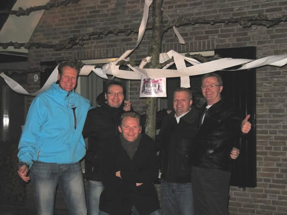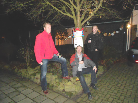Op 28 november is het alweer zes en een kwart jaar geleden dat Broertje Nico in het huwelijk trad met Lisette. De wagenbouwers lieten dit niet ongemerkt voorbij gaan en versierden de tuin met een aantal blikken. Met een select gezelschap werden de versierselen aangebracht en nam men alvast een paar biertjes op de feestdag.![]() |