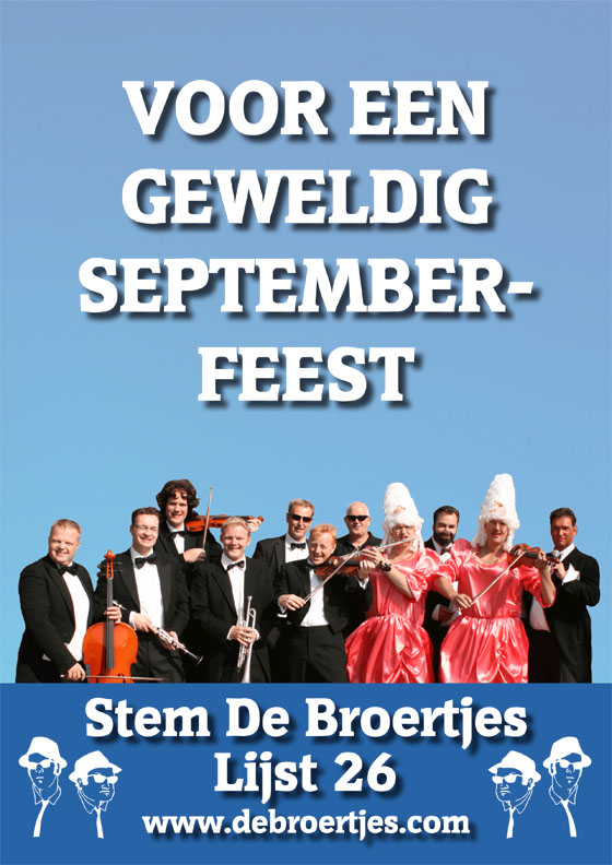 De Broertjes doen op woensdag 12 september mee aan de verkiezingen. Hiermee willen zij de problemen aanpakken en niet doorschuiven naar de volgende generatie. Het is tijd om een andere weg in te slaan. De Broertjes zijn vastberaden om een betere samenleving mogelijk te maken. De twee belangrijkste standpunten van De Broertjes zijn: Meer geld voor de optochtdeelnemers en geen entree op de feestweide. Daarnaast heeft men nog een aantal punten waarvoor men zich sterk maakt zoals: Munten voor € 1,50, happy hour tijdens het Septemberfeest, een extra dag Septemberfeest, mooi weer garantie tijdens Septemberfeestweekend en nog een heel aantal punten meer. Mocht u zich vinden in deze opvattingen, breng dan uw stem uit op De Broertjes lijst 26.![]() |