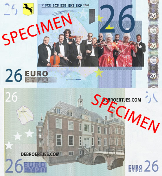 Net als bij de dorpsfeesten in omliggende plaatsten is er nu ook tijdens het begin van de Septemberfeest in Ruurlo al vals geld aangetroffen. De eerste exemplaren kwamen enkele Broertjes ook in handen. De valse briefjes zijn bijna niet van echt te onderscheiden, maar aan een aantal specifieke kenmerken kan men het valse geld herkennen. Zo is het briefje voorzien van 26 Euro, is er een groepsafbeelding op de voorzijde en heeft de achterzijde een afbeelding van een kasteel. Let dus dit weekend goed op voor deze vervalsingen.![]() |
