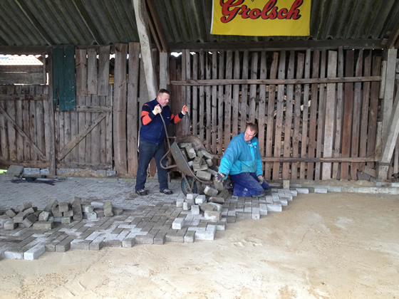 De loods waarin de optochtwagen wordt gebouwd is verfraaid. De zandvloer is vervangen door een klinkerbed. Om dit te realiseren werden de Broertjes echt een keer in het zweet gejaagd. Ongeveer 100 vierkante meter klinkers gingen door de handen van de wagenbouwer. De vierduizend klinkers gaven de dag erna de nodige spierpijn, maar het resultaat is prachtig. Na het leggen werd natuurlijk even nagepraat onder het genot van een biertje.![]() |