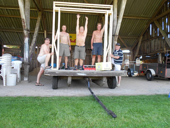 Er is eindelijk een klein beginnetje gemaakt aan de optochtwagen die dit jaar door de straten van Ruurlo zal trekken. Een bosje panlatten werd aan stukken gezaagd en vakkundig aan elkaar geschroefd tot een soort boog. De Broertjes noemen het een begin van een soort binnenhof. Gezien de dorstige omstandigheden van deze dag (33 graden)was het bouwen snel gebeurd. Volgende week zal men verder gaan met de opbouw. Ook dit jaar hebben de Broertjes weer wekelijks een riel lijf soop na het gigantische succes van vorig jaar. Deze is te zien op menu “video 2012”.![]() |