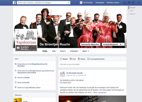 Na lang zeuren hebben de Broertjes eindelijk een eigen facebook pagina. Hierop zal, net als op de website, ook al het nieuws komen van het wel en wee van de wagenbouwgroep, waarop natuurlijk gereageerd kan worden.![]() |