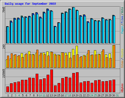 | Day | Hits | Files | Pages | Visits | Sites | KBytes | ||||||
